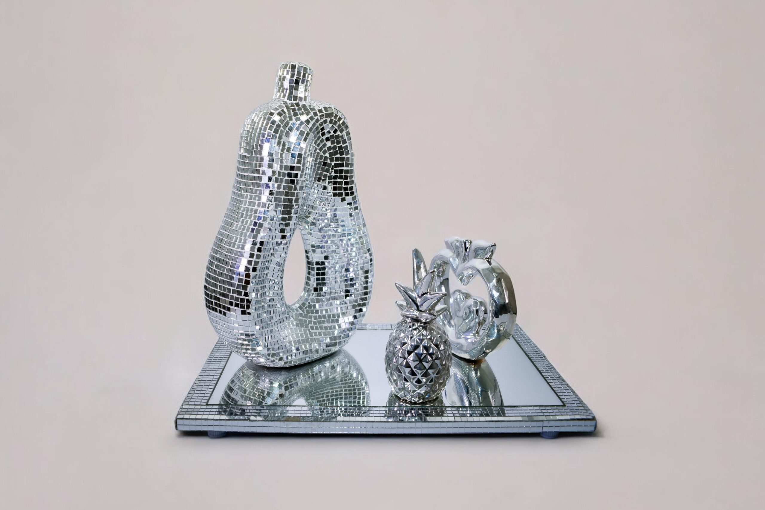 💎✨ Set decorativo plateado, compuesto por figuras modernas con mosaicos tipo espejo, una mini piña brillante y base espejada que aporta elegancia y sofisticación a cualquier espacio.