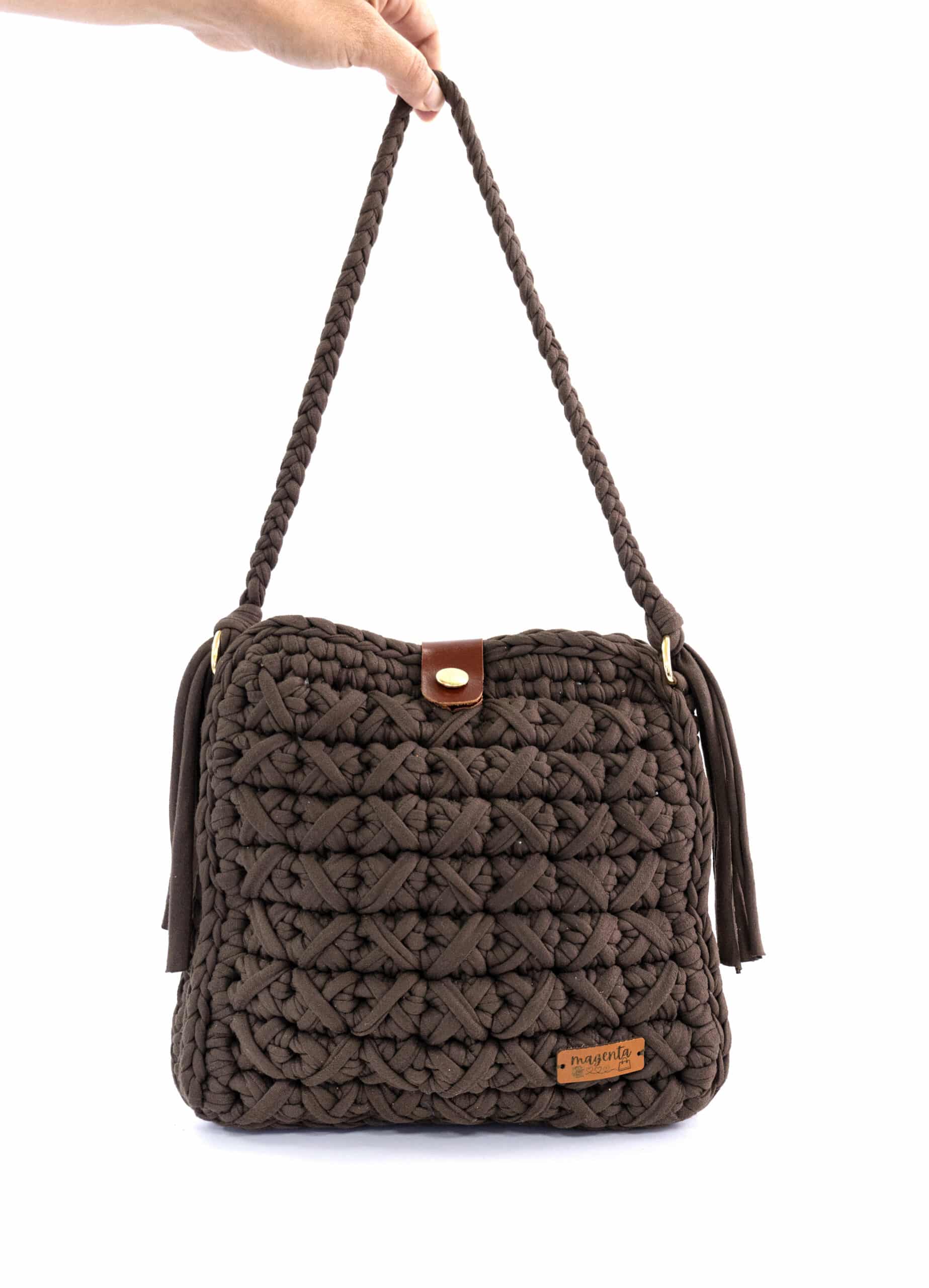 Bolso tejido en trapillo , Color verde militar, base en cuero y viene forrado en tela por dentro, 100% artesanal.